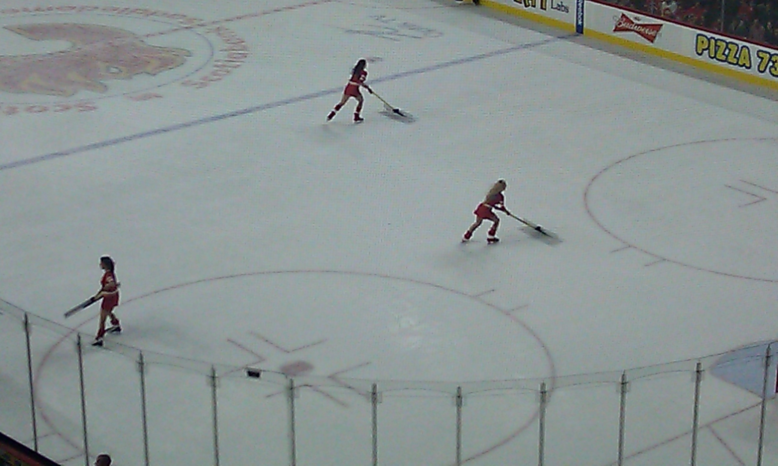 Before long there was a break and cheerleaders were pushing loose snowlike ice instead of dancing (very practical, but still good to look at). We found out that they make a break every time TV broadcast is switching to commercials. Soon also the first period was over and it was time for intermission. Everyone who hadn’t been able to grab some beer or chow or had already finished theirs, headed to the stands. Teams of kids had a competition where they had to skate over and under obstacles with their hockey sticks for speed. One team was very good – they were fast and amazingly nimble when going under the limbo line. The others kept falling over – obviously hadn’t practised as much.