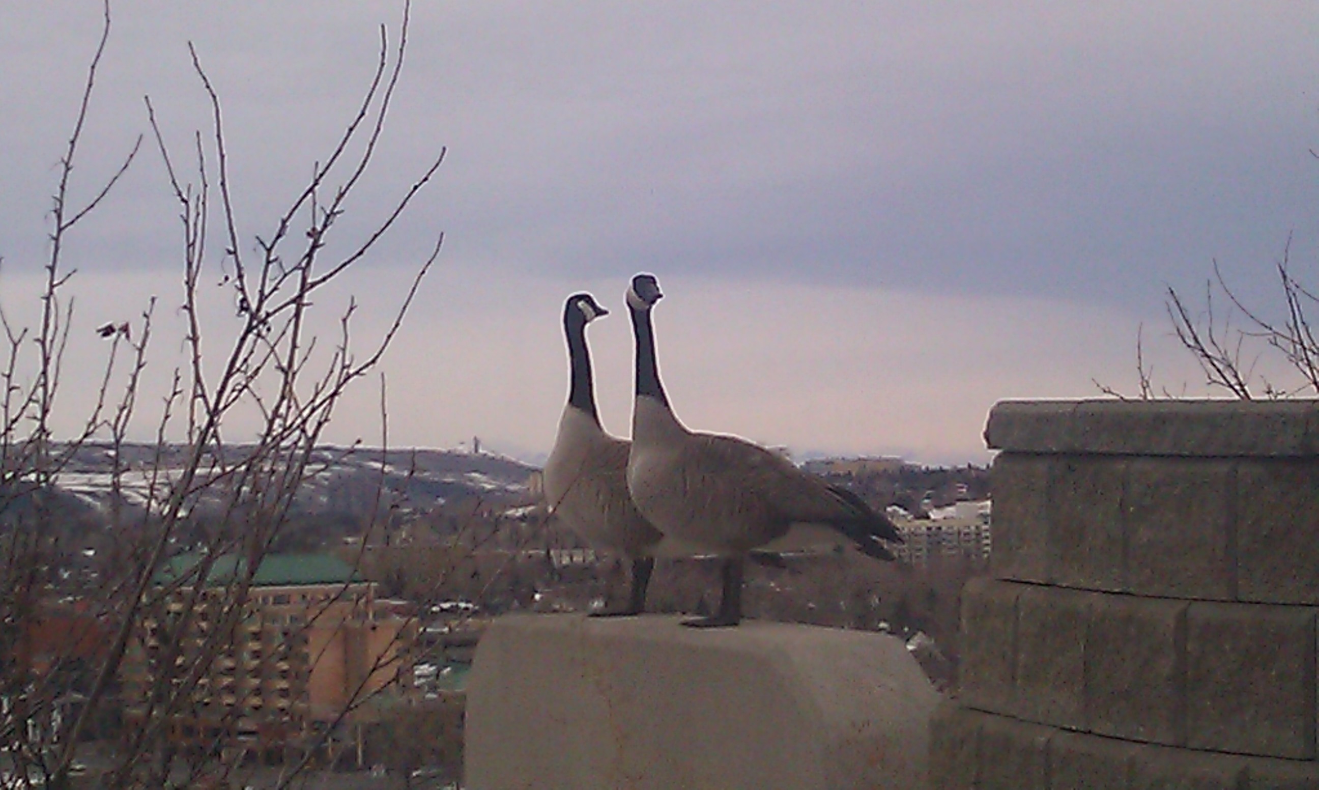 We noticed Gary and Gertrud about a month ago when they flew by making a lot of noise. Being new to Calgary we thought that maybe spring is here and the geese are returning from South. After talking to people we found out that the geese and ducks actually stay here throughout winter and brave the cold. Now we are quite used to seeing the geese fly around the tall buildings and taking a rest at the rooftops. Gary and Gertrud like to rest at our balcony. There was a single goose – probably Gerry who tried to take over their crevice on Saturday morning, but Gary showed him who’s the boss and took over the real estate after a bit of cackling and hissing. We woke up at the sound of the geese fight and they were so occupied with their own actions that they let us open the curtains and take pictures of them without paying any attention to us. They sat on their perch for quite a while, most likely taking in the sight of the river and we thought that maybe they are looking for a place to build their nest. I doubt they were perching there to see what we are up to.