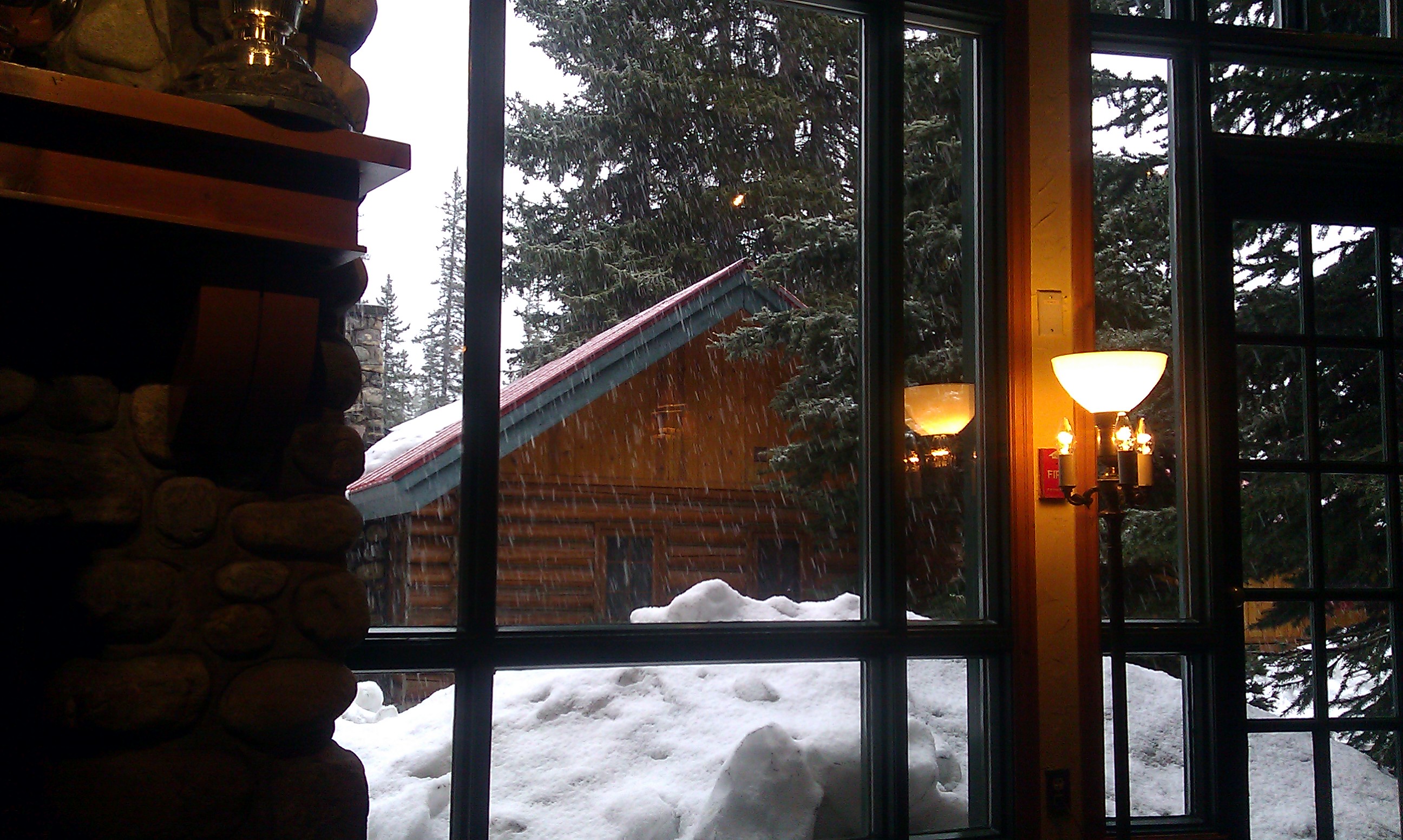We had booked ourselves a dinner for Saturday evening at Post Hotel and Spa based on a recommendation from Tripadvisor. We were very impressed indeed by the quality of the food and also the impeccability of the service. When entering the Post Hotel & Spa, we sat first at the pub with an open fireplace with real wood fire (the first we’ve seen in Canada – the rest are all gas fires). The whole ambiance was wonderful and we watched the wet thick snow coming down from our comfy chairs. Then we were led to our table with white tablecloth by the window. The menu was full of nice things to have, but I took the recommendation of the waiter and ordered game terrine for starter and caribou for the main course. My husband took foie gras for starter and cod a la miso for the main course. The food was amazing! The terrine was complemented with glazed apple and accompanied by a small bouquet of carrot, asparagus and lettuce. My mouth still salivates when I think of the caribou, though. It was the most succulent meat that I have tasted – dark, tender and with a slight taste of game. It was served with a cherry and wine sauce and with chestnuts and grapes, accompanied by mushroom dumpling cakes. Truly something to remember. My husbands cod was also superb and so were the rest of the dishes, but since the caribou was so exceptional, I might not do them justice they deserve.
